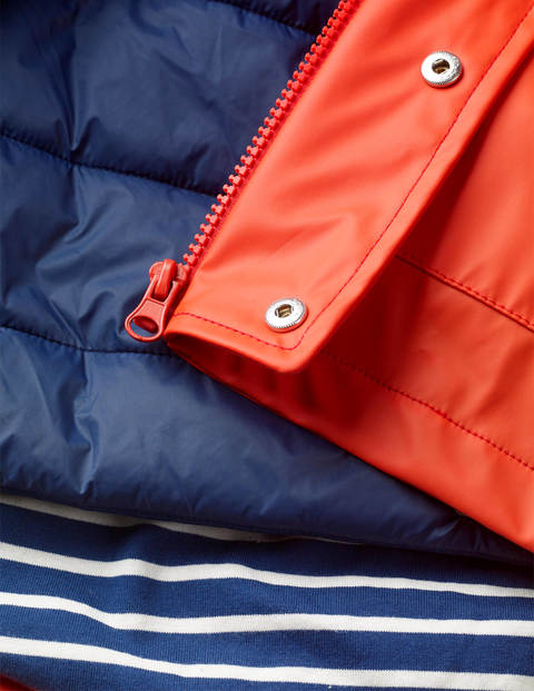 This raincoat makes cold days on the high seas as toasty as an afternoon curled up on the sofa. Made from zip-together layers that can be worn together or separately, it's a two-in-one wonder. The inside is a soft jersey-lined puffer and the outside is 100% waterproof. Big waves, do your worst. Fully lined Detachable inner layer Outer 100% polyurethane Reverse 100% polyester Body and hood lining 100% cotton Sleeve lining 100% polyester Rib 58% cotton 40% polyester 2% elastane Inner 100% polyamide Lining 100% polyester Filling 100% polyester Machine washable