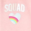 Made of 55% cotton/45% polyester fleece Rib-knit banded sleeve cuffs made of 57% cotton/38% polyester/5% spandex Foil 'squad' with heart graphic design at front Holographic foil heart stripe at sleeve Full-zip closure Kangaroo pocket Attached hood Pre-washed for added softness and to reduce shrinkage Imported